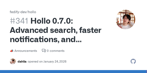 arrow-up16arrow-down1external-linkHollo 0.7.0: Advanced search, faster notifications, and improved client compatibilityplus-squaregithub.com洪 民憙 (Hong Minhee)@lemmy.mlEnglish · 21 days agomessage-square0fedilink