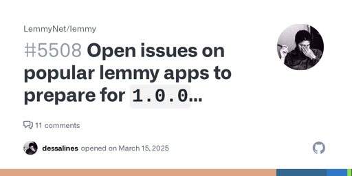 sabreW4K3@lazysoci.alEnglish · edit-28 months agoOpen issues on popular lemmy apps to prepare for 1.0.0 release · Issue #5508 · LemmyNet/lemmy · GitHubplus-squaregithub.comexternal-linkmessage-square12fedilinkarrow-up141arrow-down11