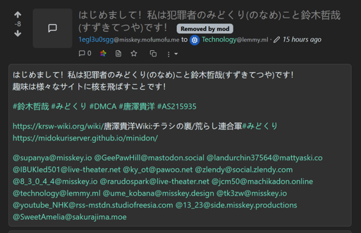 The post shown in the attached image may look familiar. A large number of Misskey and Mastodon accounts started spamming similar posts yesterday. Some have spilled over into Lemmy because the posts mention specific communities by name. The spam wave is ongoing at the time that I am making this post.