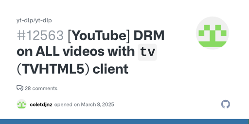 arrow-up149arrow-down1external-linkyt-dlp - YouTube DRM added on all videos with tv (TVHTML5) clientgithub.comcantankerous_cashew@lemmy.world to datahoarder@lemmy.ml · 7 months agomessage-square0fedilinkcross-posted to: [email protected][email protected]
