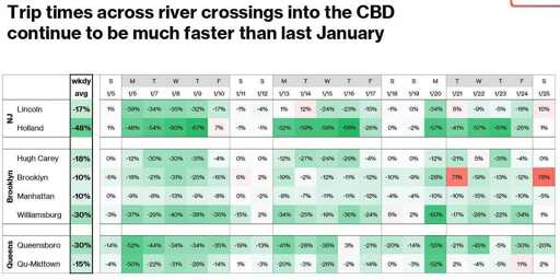 In the first month of congestion pricing, the MTA reported over 1 million fewer vehicle entries into the toll zone than would be expected without the program​, driving the significant traffic reduction seen above. It’s also worth noting that the above chart shows reduction in travel times rather than congestion—in many cases, congestion has completely disappeared, and the new travel times represent a congestion-free trip. This reduction reverses a years-long trend of rising traffic into Manhattan​ - congestion pricing took a worsening gridlock problem and solved a significant portion of it overnight. Additionally, while there were fears that congestion pricing would just re-route traffic to other boroughs, the data from the first months of congestion pricing suggests that traffic has not increased elsewhere in the city.