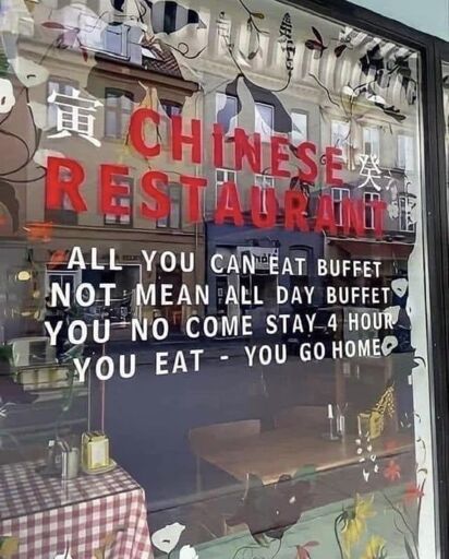 A photo of a restaurant window with the text decal reading: Chinese Restaurant All you can eat buffet Not mean all day buffet You no come stay 4 hour You eat - you go home