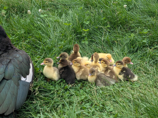 [Image description: fourteen muscovy ducklings, each a mix of yellow and brown fluff, rest in the grass under the watchful gaze of their mother]
