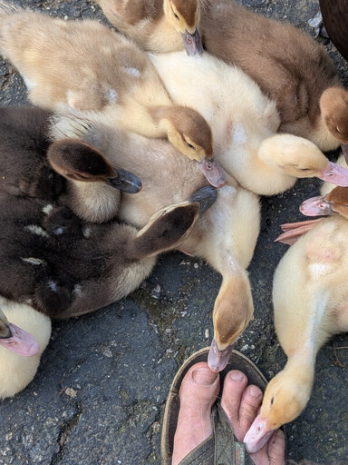 [Image description: two ducklings nibble my toes while their siblings look on to see if I’m scary or not]