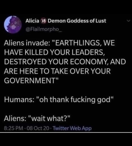 I mean it starts off with “we have killed your leaders”, to which my immediate thought is “oh sweet, good job aliens,” and then it just keeps making sense from there.