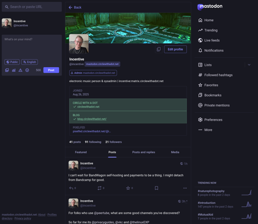 I wrote about my motivations and thoughts on switching away from centralized social media and to the Fediverse with some thoughts on self-hosting.