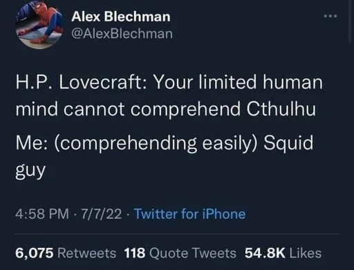 Also, Cthulhu mostly just sleeps? Comprehensible and relatable.