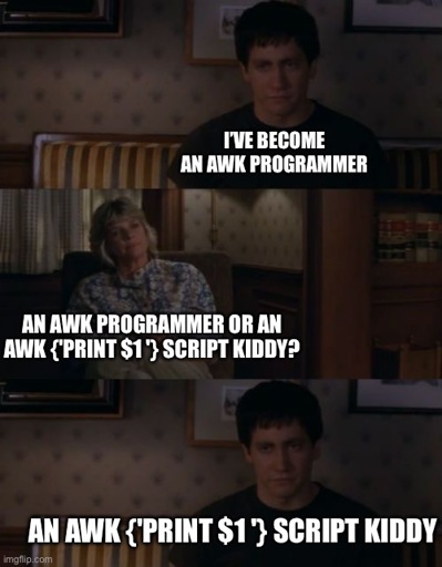 I used awk for the first time today to find all the MD5 sums that matched an old file I had to get rid of. Still have no idea what awk was needed for. 😅 All my programming skill is in Python. Linux syntax is a weak point of mine.