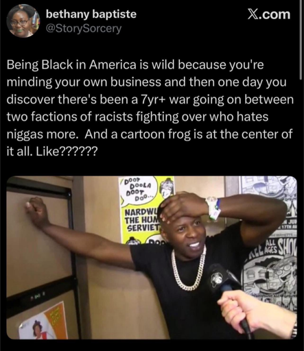 If anyone’s feeling pretty hopeless about finding this out for the first time, I recommend this documentary about the cartoon frog’s creator suing Alex Jones and trying to take back his ownership over Pepe from the white power weirdos. It’s very uplifting and the artist is a pretty likable guy.