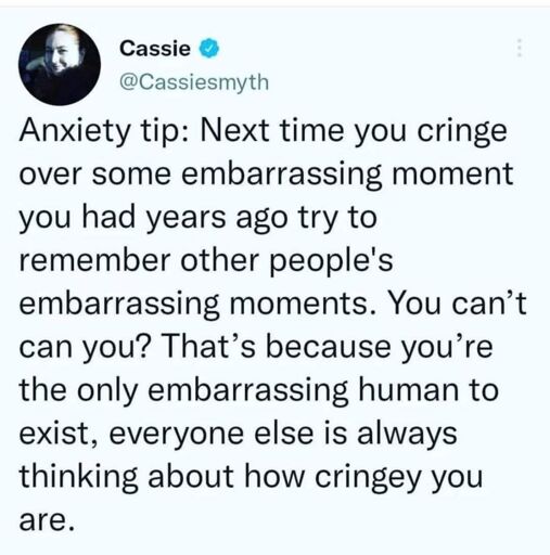 I feel 3rd party embarassement (I am embarassed seeing someone else do something cringey) more than 1st party (feeling embarassed by my own cringe) so I know this ain’t true. I think about how embarassing YOU are all the time.