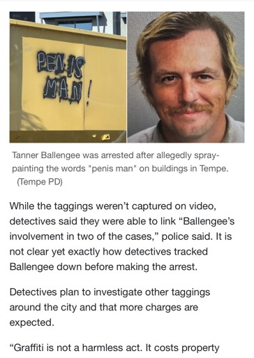 arrow-up1186arrow-down1imageTempe Police arrest man suspected of vandalizing "Penis Man" on buildingslemmy.todaypostcapitalism@lemmy.today to Funny@sh.itjust.worksEnglish · 1 month agomessage-square37fedilinkfile-text