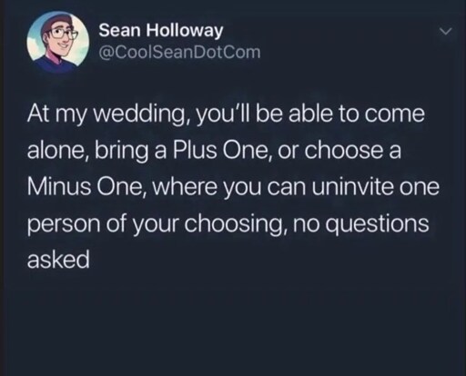 I was picturing something realtime. You get an app where you can type your +1 and you get a list of all the guests. You tap someone you get to -1 them. At any point you might get a notification hat you have been -1’d and you can go +1 yourself and bring no one. If you are not +1ing your self then your +1 can get -1’d in which case you can’t invite someone else (I’d love to make it so that you can change your +1 to someone else but then the other person might change their -1 to the new person and it turn into a cycle, or -1 are permanent and prone to abuse)