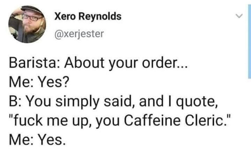 minus-squaredon@lemmy.calinkfedilinkarrow-up29·17 days agoOkey dokey. One cup very hot water, a single arabica bean, and 10g pure caffeine. “Here you go, traveler, it is one of my strongest potions. Strong enough to slay dragons. I recommend picodosing to start, but do as your need demands.”