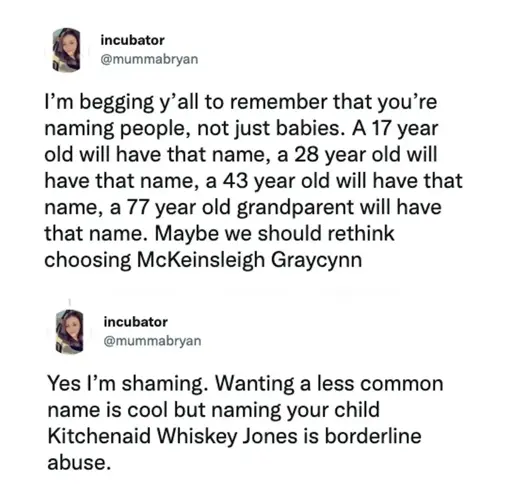 I thought about changing my name, but never did it. Mine isn’t even one of those horrible names, so I’m wondering the mindset of the kids who do grow up with the ridiculous ones. Do they double down and rabidly attack anyone who suggests they change it, or secretly hate it so much that they refuse to acknowledge they ever had it after they change it, so that to us it seems like there aren’t many people out there that have changed their name from the fart-sniffing parents’ choice? I only say this, because I think somewhere like new zealand publishes the list of names they reject, and there are some doozies on it.