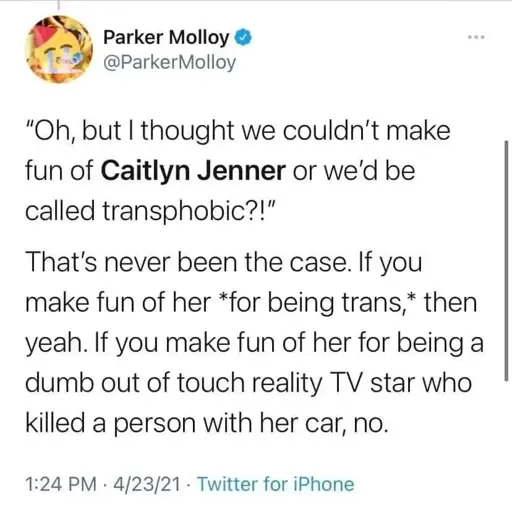This is like saying you can’t make fun of Kristi Noem because she’s a woman. If you mock her for being a woman you’re a piece of shit, if you mock her for all of the horrible things she does and says you’re fine. Her sex and gender have nothing to do with her being an awful stain on humanity (and dogkind).