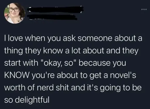 my “okay, so…” beginning are usually trying to break my specialty into human-understandable language and prep an analogy. aint nobody but my nerdboi peers care about the dinglehooper flooting the yoonerbix .001ms faster than the yumdumtrum.