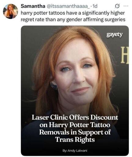 I never got into HP, but I could see having a tattoo I’m happy with in 20 years. I’m leaning towards some sort of cute critter on my wrist, right where I bite when I get overwhelmed. I’ve tried temporary tattoos there and they help break that cycle: I don’t want to bite a tiny dino or whatever. (Obligatory Yes, I have a therapist, no, this doesn’t come up that often. )