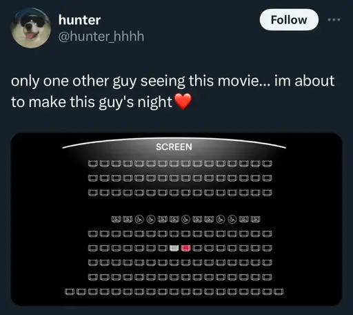 Personally, I hate the assigned seating shit at the theatre I go to just because it’s smaller and fewer people are there, especially at matinees, that it just isn’t needed. Like, at all. Even a huge, hyped blockbuster doesn’t pack this place.