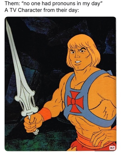 Has anyone ever asked you to call them a neopronoun? Like I’ve been in some queer as fuck spaces and I’ve never encountered someone with neopronouns. I don’t most people have. So it seems the anger is more at an entirely imagined scenario where someone might ask you to call them (oh wow, so confusing) a neopronoun?