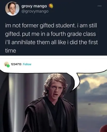 the anakin image was reposted from twitter to tumblr by someone who’s name is cropped out, then someone reblogged that post and added the speech bubble. when you reblog a post on tumblr if you add anything to it it’ll display under the first one like this