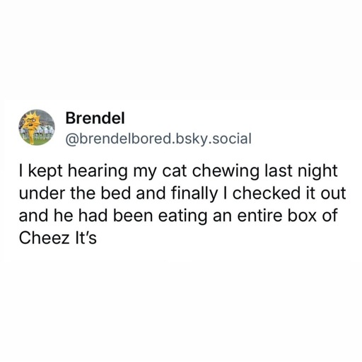 A Bluesky post from Brendel @brendelbored.bsky.social that reads “I kept hearing my cat chewing last night under the bed and finally I checked it out and he had been eating an entire box of Cheez It’s.”