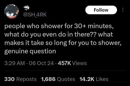 Stamets@lemmy.dbzer0.com to People Twitter@sh.itjust.works · 15 days agoI can undress, shower, dry and dress in less than 10. WHAT ARE YOU DOINGlemmy.dbzer0.comimagemessage-square231fedilinkarrow-up1316arrow-down121