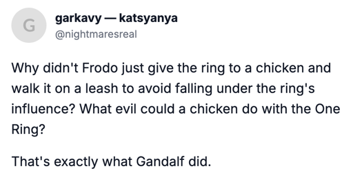 They’re gonna have a good story to tell Gandalf about how they lost the ring while orcs are marching them to mount doom.