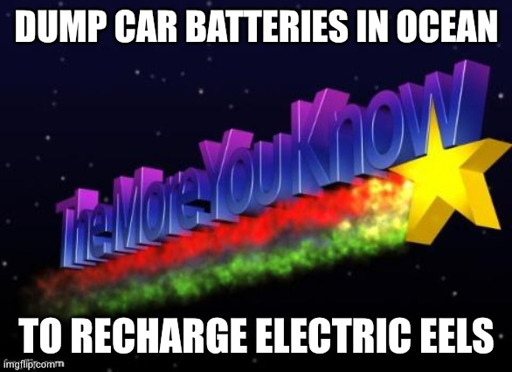 I was going to correct the meme and point out that the batteries need to go in the rivers where the electric eels live, but I forgot they go party at the Great Barrier Reef.