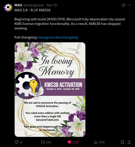KMS38 has now been removed from the MAS script. Users are advised to use HWID or TSforge activation instead.