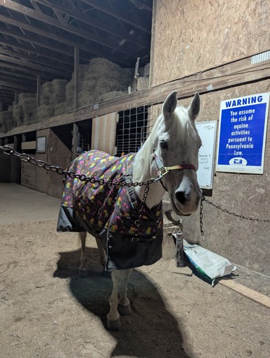 As for Sandy’s blanket, it’s the most fashionable one I’ve seen so far at the barn. Rainbow is totally ber color