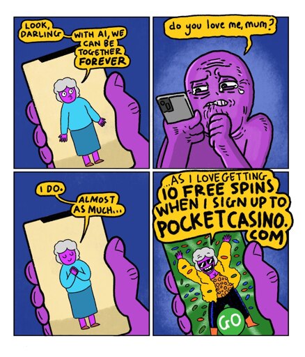In case somebody doesn’t know about the nightmarish AI product this comic is referencing: https://bsky.app/profile/did:plc:tq6gqh5aaohgi55y2yofylwj/post/3m5k4ojtgs22r