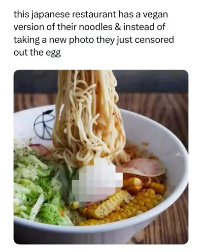 minus-squareViking_Hippie@lemmy.dbzer0.comlinkfedilinkEnglisharrow-up3·4 hours ago“Can I have the noodles with no testicle, please?” waiter, under their breath “fucking tourist prudes”