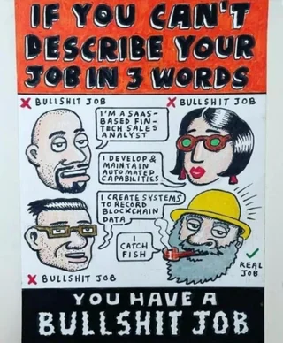 We need to lower standards. Really. To something like “if your job makes other people worse, it’s bullshit work”. A lot of good people do stupid job just to put food on the table