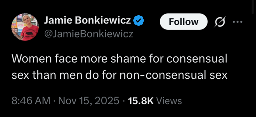 But across the board, we have insults that every kid knows, which equate to “woman having (consensual) sex bad”, as well as gossip of the like, and even men being shamed for going out with a woman who has sex.