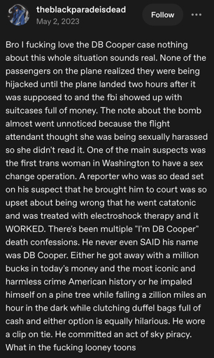andros_rex@lemmy.world to Lemmy Shitpost@lemmy.world · 1 day agoHappy DB Cooper Day to those who celebrate!lemmy.worldimagemessage-square42fedilinkarrow-up1613arrow-down16
