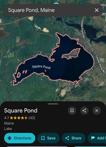 Back in 1900 Square Pond was considerably larger than it is today and its shape was different. However, a mill company dammed the streams leading into it reducing its volume greatly. Prior to this it was known as Crystal Lake. Due to over development, the lake is dying from lack of oxygen.