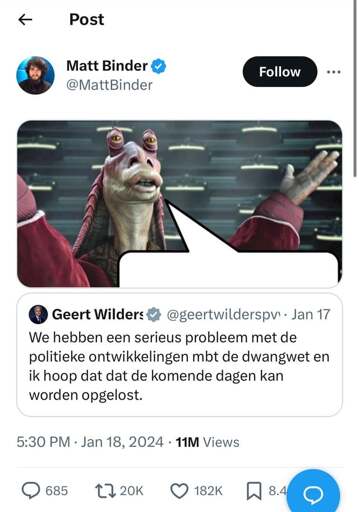 (Screenshot of a social media post, user posting an image of Jar Jar Binks with a speech bubble for the post replied to. Post is from a Dutch politician stating "We hebben een serieus probleem met de politieke ontwikkelingen mbt de dwangwet en ik hoop dat dat de komende dagen kan worden opgelost. ")
