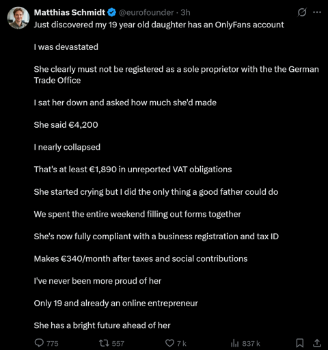 I mean, its not the life Id want mybdaughter to have. But neither is doing 6 months for tax evasion and having a criminal record that will bar her from ever trasitioning into many worthwhile careers if she ever wants to give up Onlyfans.