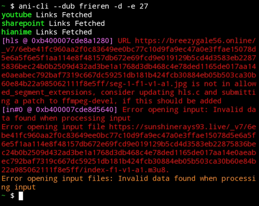 Uri@infosec.pub to Piracy: ꜱᴀɪʟ ᴛʜᴇ ʜɪɢʜ ꜱᴇᴀꜱ@lemmy.dbzer0.comEnglish · edit-216 days ago[fixed] Can anyone help me? I'm getting this error while downloading with ani-cli. I'm using it on termuxinfosec.pubimagemessage-square7fedilinkarrow-up135arrow-down11