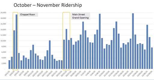 KC Streetcar Ridership Soars Following Main Street Extension Opening KC Streetcar ridership has surged to record-breaking levels following the October 24th opening of the Main Street Extension. Even with rainy weather and cool temperatures dampening Kansas City, streetcar ridership drew nearly 35,000 passenger trips during the three-day opening weekend. November 2025 has seen the highest