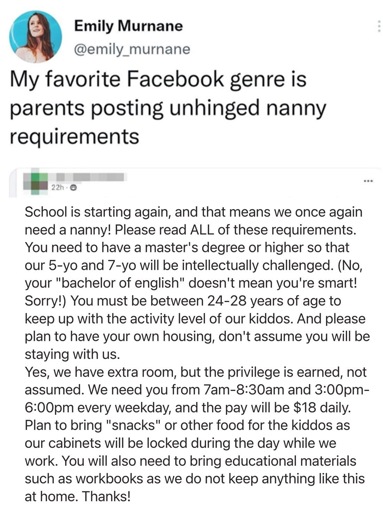 My wife was an au pair, she’s still in a few nanny/au pair Facebook groups and sees posts with asinine requirements all the time.