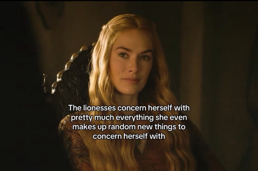 I honestly thought this was a joke about this character specifically. It didn’t come off as “dumb woman annoying” to me, it came off as an in-joke about how this character. I didn’t watch GoT but obviously we all know bits about it by osmosis, I thought one of the main things about Cerci was that she is like, super paranoid and reacts to plots that aren’t there, sort of a Caligula/Nero type? Or maybe Tiberius I guess, I don’t know how malicious she was written as.