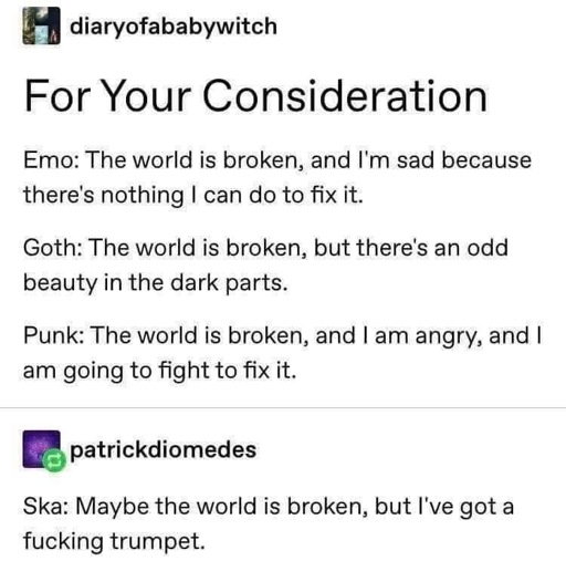 Damn, I didn’t realize I was ska until just now. I in fact have a trumpet and a coronet. And the first live show I ever got high at was Skankin Pickle touring Skafunkrastapunk. Somehow completely unrelated I ended up with their bass drum kick pedal about a year and a half later. I don’t even listen to ska though. But the attitude is all mine!