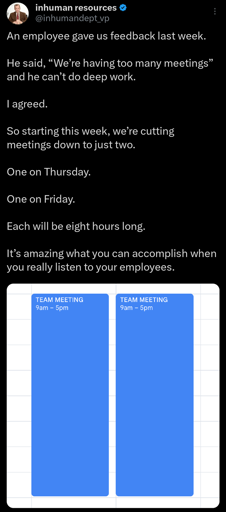 I mean, all jokes aside… I would legitimately rather have 16 hours of meetings in two days than have that same 16 hours of meetings spread throughout the week with small breaks in between. At least there’d be 3 days to actually get stuff done uninterrupted.
