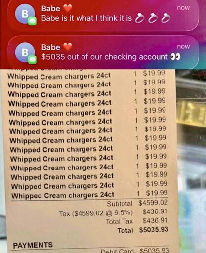 The receipt total $4599.02 doesn’t add up if they only got Whipped cream chargers 24ct for $19.99 they could get 230 boxes and then buy something else for $1.32
