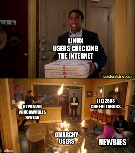 ToasterBotnet - Productivity and Memes@piefed.social to linuxmemes@lemmy.worldEnglish · 6 days agoHyprland Updatemedia.piefed.socialimagemessage-square75fedilinkarrow-up1327arrow-down112