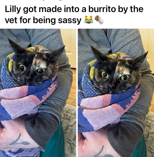 One of mine took 3 people (including me), 2 pairs of gloves, 2 towels, and half a cat carrier to finally vaccinate. Next visit I told the vet she’d need sedated. He said “I’ve dealt with calicos before.” I then heard what legitimately sounded like a large wild cat screaming. He came back in and informed me they’d need to sedate her.
