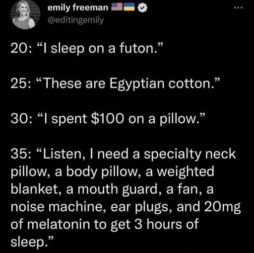 Same. I’m more healthy than everyone I know my age, and at 40 something my sleep is getting increasingly horrible. While people a lot less healthy sleep 8h every day. I’m so jealous…