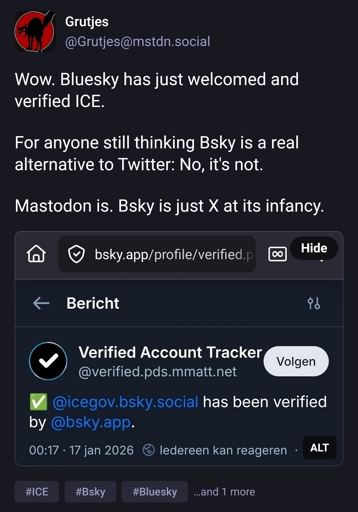 While i agree fediverse is then solution and i don’t use bluesky, i don’t see the issue is recognizing ICE as verified.
