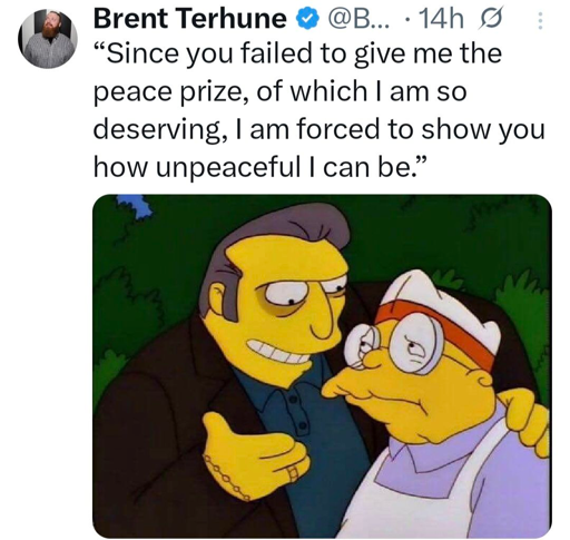 arrow-up1918arrow-down1imagePeace prizelemmy.carabber@lemmy.ca to People Twitter@sh.itjust.worksEnglish · 3 days agomessage-square17fedilink
